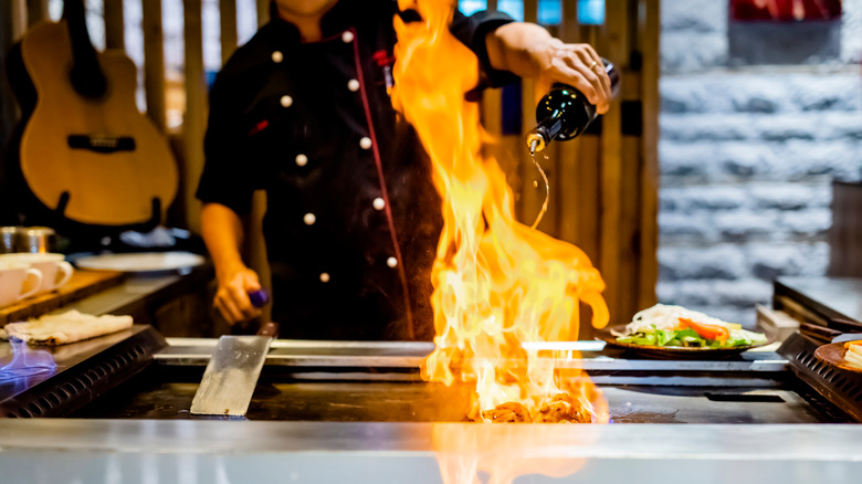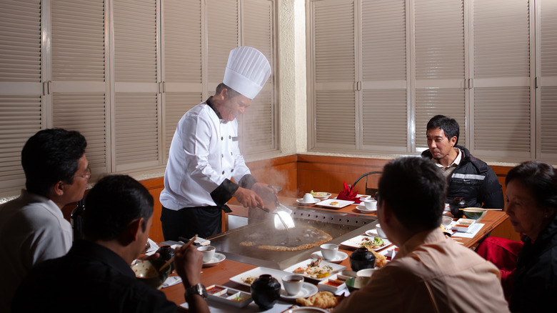The theatrics that take place naturally spark conversation, applause, and a general uptick in human enthusiasm, which is why many "oohs” and "ahhs" are common sounds in such restaurants on any given evening. While the energy is expected and enlivening, it's important to remember that manners should not fly out the window. You should always keep your elbows off the table and chew with your mouth closed, but there are also some rules of etiquette specific to hibachi restaurants. Will breaking them get you banned for life? Probably not. But following them could earn you the respect of the chef.