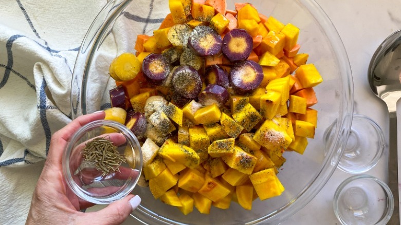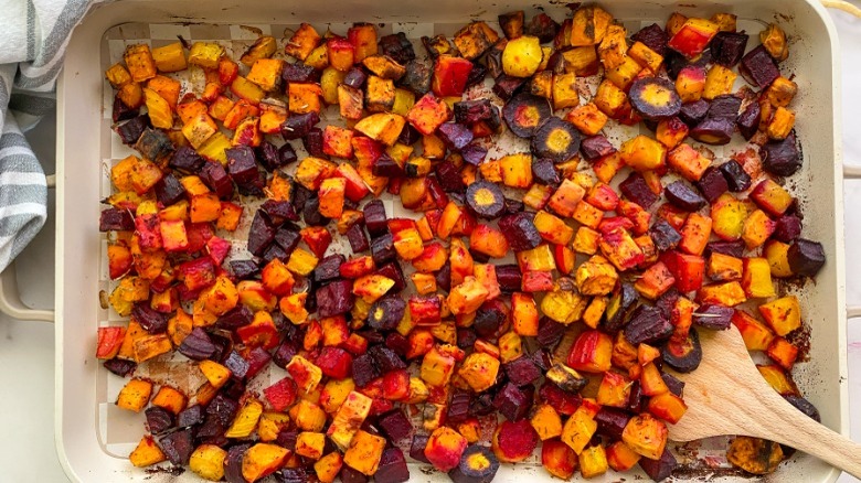 To make this recipe, you'll of course need some root vegetables. In the produce aisle, grab some red and golden beets, sweet potatoes, and carrots. "I like to use 2 types of beets and heirloom carrots if I can find them to add in some different colors," Hahn shares. You'll also need some avocado oil, salt, garlic granules, dried rosemary, dried thyme, and pepper. "If you want to add some fresh flavor to the vegetables, pick up some fresh herbs like Italian parsley or basil for topping the cooked vegetables," Hahn remarks.