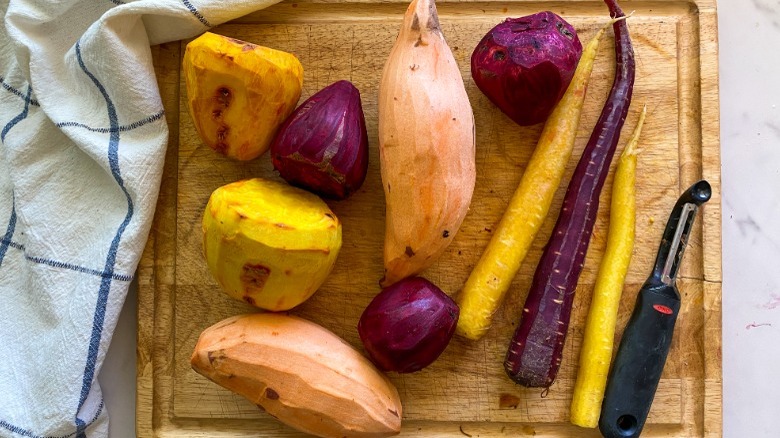 To get started, preheat the oven to 400 F. Peel and chop the beets, sweet potatoes, and carrots into bite-sized pieces. "They will shrink a bit after cooking, so you don't want to dice the vegetables, or they will be too small. Just make sure they are roughly the same size, so they all cook evenly," Hahn shares.