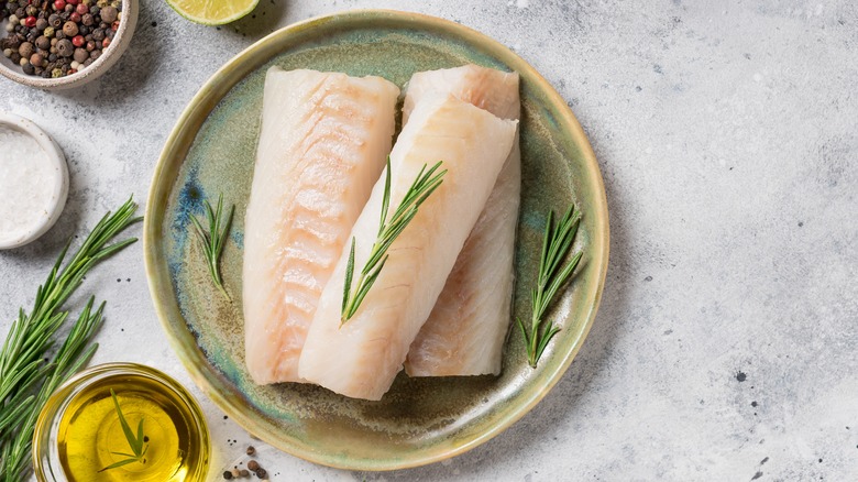If you've ever purchased cod before, you know it can be pricey. But if you're in the mood for white fish, we think it's worth spending the extra money to spring for cod. Since cod is such a big fish, you're going to get thick, juicy filets that soak up the flavor of whatever you cook them in, which is why we think poached cod is such a treat. The flavor of the cod itself is quite mild and lacks a super-fishy quality. This makes it a great choice for those who don't typically enjoy seafood.