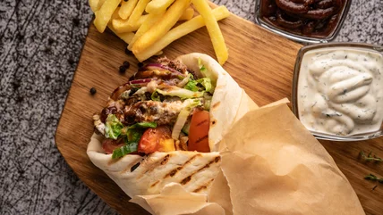Although similar in appearance and cooking process, the gyro is not to be confused with shawarma. Originating in Greece, the name "gyro" means "round," which refers to how the meat is roasted vertically on the skewer in front of a heat source. Like shawarma, the gyro is said to have a long history. With the Greek meat sandwich, its origins may go back to Alexander the Great's army, which cooked skewered meat over fire.