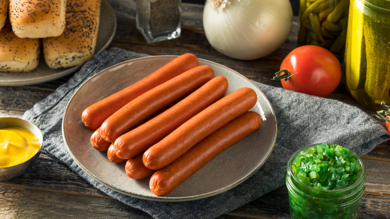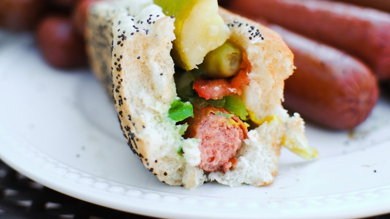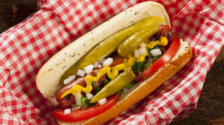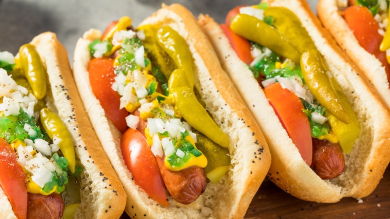 New York, for example, likes a hot dog with spicy brown mustard and either onions with tomato paste or even a bite of sauerkraut. Alternatively, Atlanta brings out the slaw to coat its hot dogs in, and Detroit prefers its hot dogs covered in chili with cheddar cheese and onion. They call it the "Coney Dog," and it's so messy you won't want to forget a stack of napkins. Then, of course, you have the Chicago-style hot dog. While other regional favorites include a focus on limited toppings of meat or other condiments, a Chicago-style hot dog is absolutely overwhelmed with toppings and condiments.