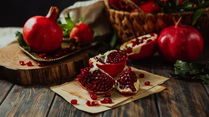 Pomegranate season comes and goes too quickly. From September to November,this seedy fruit is at its sweetest. Of course, the pomegranate has a long shelf life, so while their season is quick, you can find them in grocery stores throughout the year. It's seeds are perfect in a salad, as a snack, or, if you want to borrow a couple pages from Padma Lakshmi, as a topping on peanut butter toast or for added texture with sautéed zucchini. Pomegranates are a powerhouse fruit.