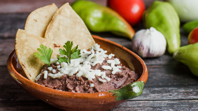 Often served alongside rice at Mexican restaurants, refried beans are a staple side dish packed with fiber and full of flavor. Though it's often assumed that they're made with black beans, the dish surprisingly started with pinto beans and is now incorporating other types like red kidney beans. Fairly new to Mexican cuisine, refried beans made their grand debut about 100 years ago, which isn't very long compared to other traditional dishes.