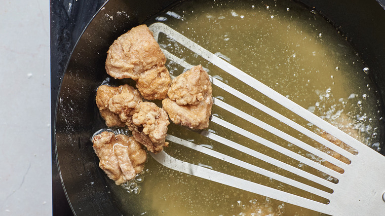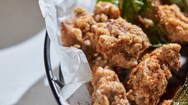 Grab the Sichuan powder you prepared and sprinkle it on the warm chicken. The powder will adhere to the chicken best directly after frying, so try to do this right away. Once you dust the chicken, let them cool slightly, then dig in. These are delicious dunked in sriracha aioli or teriyaki sauce and served alongside other late-night foods like soup dumplings, bao, and scallion pancakes. These aren't the best next-day food, since like most fried foods, they get a little soggy and sad in the refrigerator. That doesn't mean they can't be saved, though: You can microwave them, bake them for a few minutes, or air fry them back to crispy. The best idea? Save a few in the refrigerator or freezer to reheat after a night out, and enjoy them the real way — late at night and hungry.