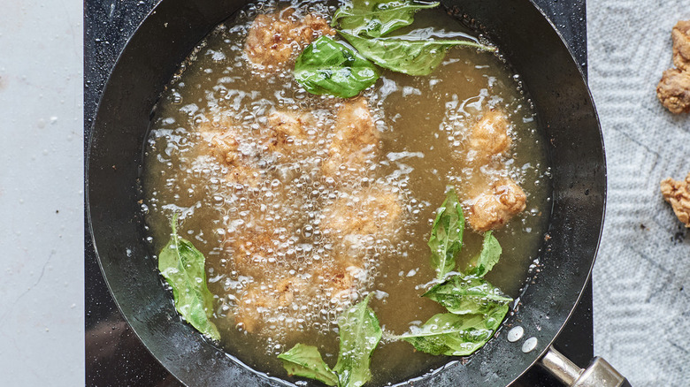 While you're double frying, toss in the basil leaves. Don't skip this — the crunchy basil is a uniquely savory-sweet flavor that compliments the chicken perfectly. The basil takes on some of that chicken flavoring, making it almost potato-chip like with a hint of sweet. Drain everything on paper towels after removing from the oil.