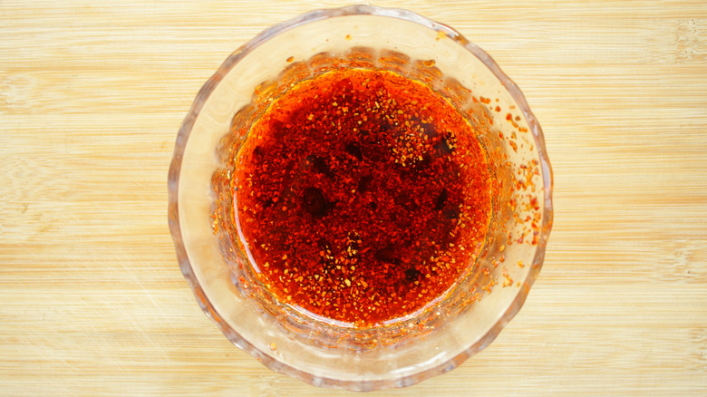 If you've ever made fried eggs, you already know how to make chili oil eggs. The essential ingredient you'll need on hand, of course, is chili oil. In a video with over 200,000 likes, TikTok creator @snackqween uses the brand Lao Gan Ma Spicy Chili Crisp, but use whichever one meets your taste and spice level preferences. Place a few teaspoons in a frying pan, crack in a few eggs, and let them snap and sizzle as they cook and soak up the spicy flavors. Just like with pesto eggs, you can also drizzle a little oil on top of the eggs while they cook. You may not need it, but you can also add a pinch of salt and pepper.