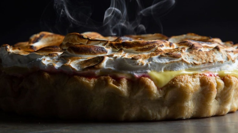 Lemon verbena has an herbal side to its citrusy flavor, so the rosemary in this recipe only helps to accentuate it. The two herbs are steeped in a milk-based mixture that's whisked into a silky custard. This layer gets a classic pairing in the form of meringue. Plus, there's raspberry compote — a tart counterweight to the other sweet ingredients. Baked in a pie crust, this dessert contains the best of summer in every bite.