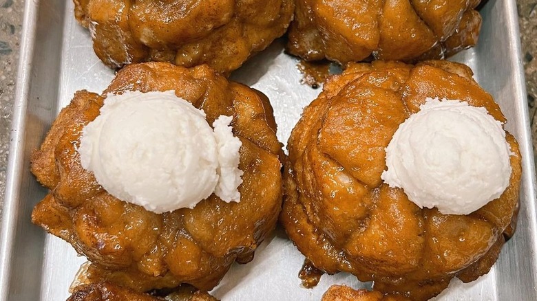 If you're unfamiliar with monkey bread, we feel sorry for you. This was a childhood favorite of ours, and it still hits to this day. Here's some background for you in case you have no idea what monkey bread is: So, monkey bread is the actual name of the dessert and the name of the shop in OCNJ. Monkey bread is essentially a mashup of cinnamon buns and sticky buns, drizzled with white frosting and made into a fun dome shape.