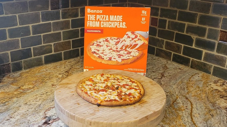 If you're morally opposed to cauliflower crust but can't get down with gluten, you do have other options. One of them is Banza's selection of pizzas, which use a crust made from chickpea flour. The base itself comes out pretty unique. It's not like frozen pizza dough in terms of taste or texture. Instead, it's oddly similar to the hardened, crumbly pastry you usually find at the bottom of a quiche. It's not bad, but it will be pretty obvious to anyone eating it that this isn't a traditional frozen pizza.