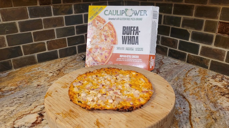Caulipower's Buffa-Whoa is probably the most crushing disappointment on the list. Many brands, including Caulipower, have cheese options, a veggie selection, and pepperoni — but buffalo chicken pizza is a chance to really stand out. It's not the only company that offers this option, but it is a pretty rare pizza type. Caulipower also boasts about being "America's #1 Gluten-Free Pizza Brand," so expectations were pretty high here.