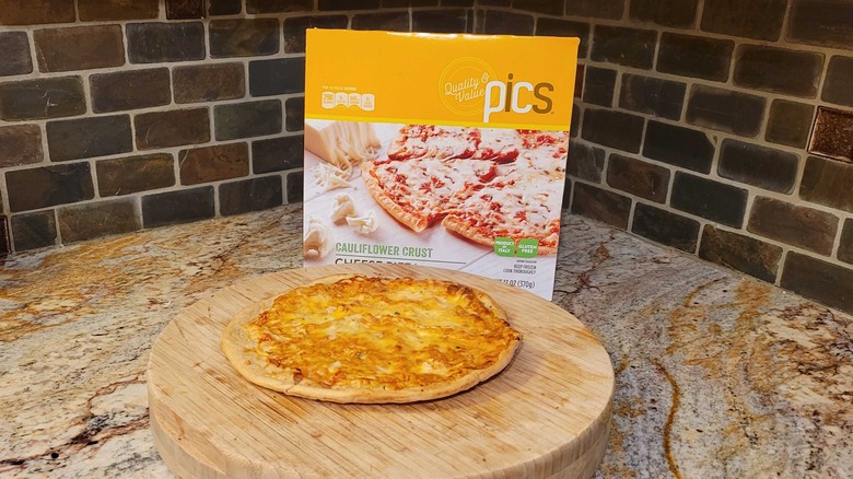 Pics is a store brand found in Price Chopper supermarkets. If you're living in the North Eastern United States, you may be able to get your hands on the brand's attempt at gluten-free pizza. As the old saying goes, you take the first bite with your eyes. Unfortunately, if the Pics Cauliflower Crust Cheese Pizza we got is anything to go by, that bite is going to be unpleasant — and it's all downhill from there. When you remove the packaging, you'll be greeted with a sight not too dissimilar to cat vomit smeared unevenly across an asymmetrical cauliflower base. Its looks don't really improve after a quarter of an hour in the oven.