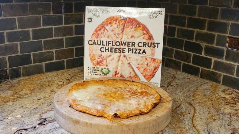 Like all other "Great Value" items, Walmart's "Margherita Cauliflower Crust Pizza" is pretty cheap — coming in at close to half the price of the other gluten-free options. However, unlike other budget picks, it's actually pretty good. The crust was reasonable, with a very firm, crispy bottom, though the toppings seem to have made the top of the crust slightly soggy. It also features one of the better sauces we sampled on this journey. It was incredibly flavorful and not overly sweet.