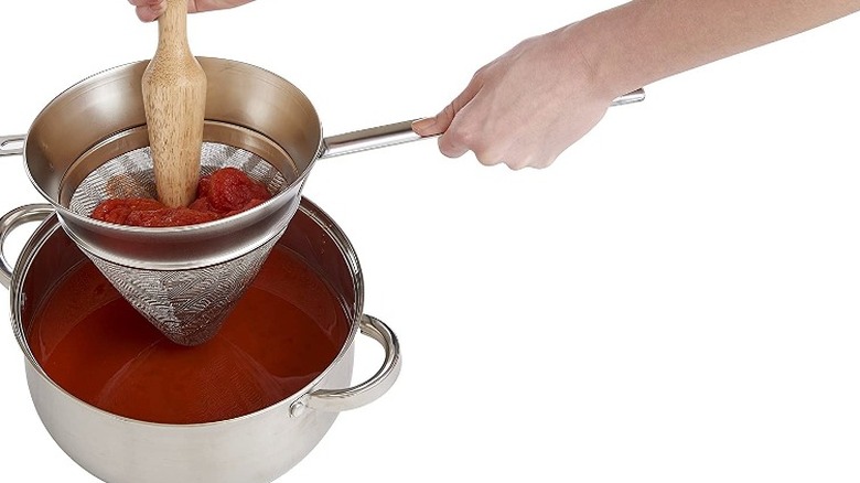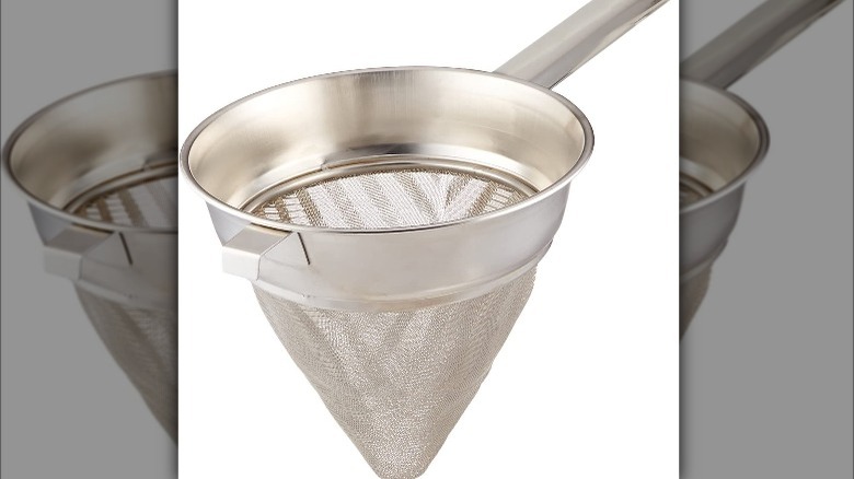 Watch nearly any episode of "Top Chef," and you'll see at least one contestant pulling out a chinois to finish off a sauce. And there's a very good reason for that. Using a chinois guarantees a silky, smooth finish for whatever liquid is passed through it. It will remove any bone or meat fragments from a homemade chicken or beef stock to produce a clear broth. Sometimes a chinois is called a bouillon strainer because of how well it does this job.