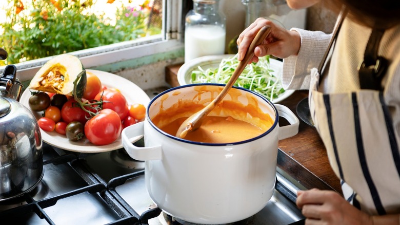 While the chinois is strongly associated with soups and sauces, it can perform a number of other tasks as well. Chef Nick Tamburo explained to Eater that "You can use a chinois for everything you would use a colander for, plus so much more." So when you're colander is dirty, and it's time to drain the pasta or rinse off some berries, feel free to reach for the clean chinois on the shelf. A chinois can also be used in place of cheesecloth when making yogurt or homemade ricotta cheese because of its fine mesh. Some turn to a chinois when making almond or nut-based milks because it neatly separates the liquid from the nut solids. Bakers might also find the chinois useful as a spare sifter.