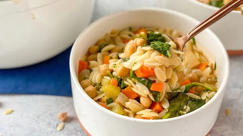 The way we do it at Tasting Table, vegetable soup is anything but boring. This chickpea orzo soup combines both pasta and beans to create a dish so flavorful and satisfying that you won't even notice it's vegan. Lemon juice adds brightness and acidity, while the miso broth packs a knockout punch of umami. This recipe boasts all the protein of a chicken-vegetable soup with lots of fiber to boot.