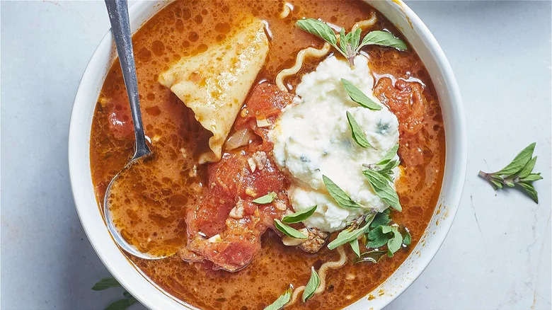 Unlike its namesake layered pasta dish, this deconstructed lasagna soup takes less than a half hour to put together. Beef, hot sausage, lasagna noodles, and pesto float around in a tomato broth, making for an uncanny flavor doppelganger. But what really makes this dish a home run is the topping: a dollop of whipped ricotta cheese, which is added to serve.