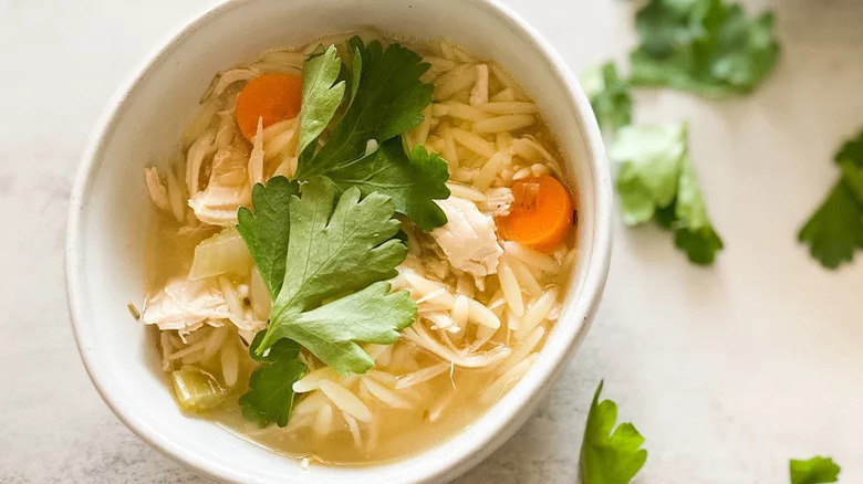 This lemony chicken orzo soup is warming in the wintertime but still bright enough for sunny summer days. The classic base of chicken and pasta is livened up with both lemon juice and zest, then complemented by an herbaceous twist of rosemary. This dish is a great way to use up leftover chicken breast — or, to make a vegan version, simply substitute the chicken for chickpeas or soybeans, and opt for vegetable broth.