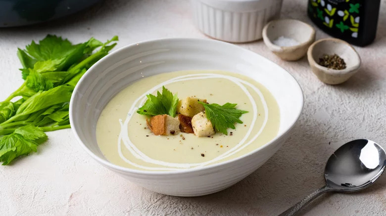 Celery has been having a moment lately. Outlets have been singing the praises of celery juice, and Martha Stewart reportedly adds it into her green juice every morning. But today, we're talking about this vegetable's perhaps lesser-known but just as newsworthy medium: soup. It's a simple ingredient lineup of celery, stock, potato, garlic, and onion — all blended into a velvety purée that's mixed with milk and cream.