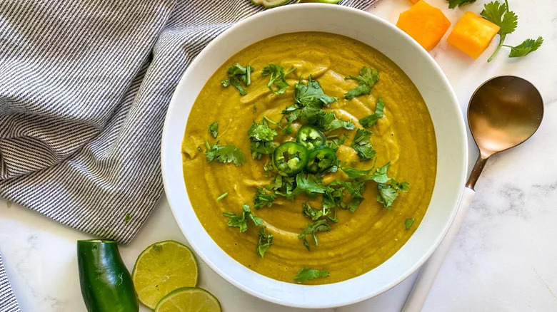 Take full advantage of peak soup season (or fall, as non-foodies call it) with this butternut squash soup. Its Thai-inspired twist takes an otherwise mild soup to a savory new echelon. The autumnal squash first gets roasted in the oven, which enhances its natural flavor. Lime juice, lemongrass paste, and coconut milk build a mosaic of flavors, while grated ginger, serrano chiles, and turmeric turn up the heat.