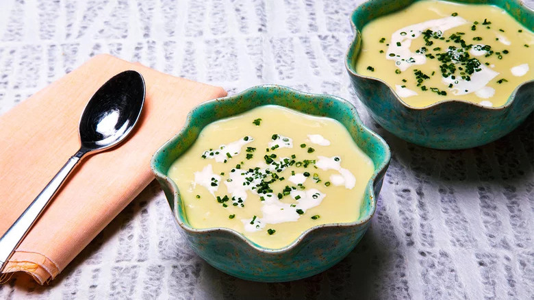 Vichyssoise is a fancy name for a decidedly uncomplicated dish: potato and leek soup. Still, its simplicity doesn't make it any less great, even earning it a permanent residency in the elite lineup of traditional French dishes. To make this version, leeks, garlic, onion, Yukon Gold potatoes, and chicken stock are simmered with a bouquet of herbs, puréed until smooth, and mixed with heavy cream and lime juice and zest.