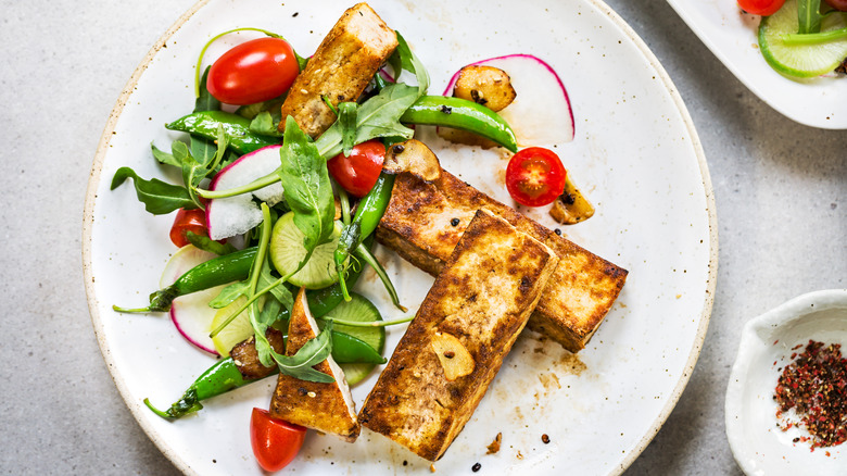 One modern technique that is nevertheless easy to execute is plating foods on a curve, often seen at fancy restaurants. Foods arranged in swooshes and arcs create a sense of fluidity and help our eyes travel across the plate, noticing all its elements — similar to how the golden ratio works. Additionally, this technique works best on round plates, which likely comprise most of your tableware repertoire. Repeating straight vertical and horizontal lines can create eye-pleasing, logical patterns and add dimension to a dish. Play around with sauce placement and asymmetrical garnishes to avoid monotony with this approach. Finally, the rule of thirds can be applied by placing the dish's main component at one of the intersection points, then arranging the other parts around it. Whichever method you choose, remember that these patterns are simply guidelines and that creativity and personal style should also play a role in the plating process.