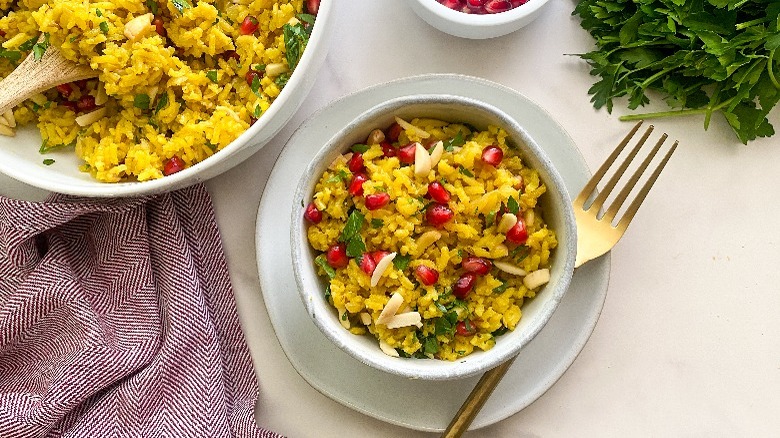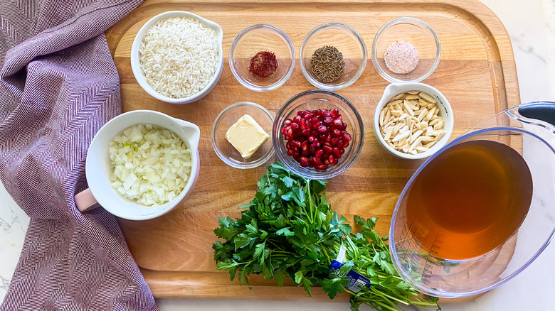 The other spices we need are cumin seeds and salt. In the produce aisle, grab an onion, either a pomegranate or a tub of pomegranate arils, and some flat-leaf parsley. The remaining items are butter, white basmati rice, broth, and sliced or slivered almonds. "When buying the rice, note that white and brown rice can't be used interchangeably in this recipe. The cooking time will be much longer with brown basmati," Hahn explains.
