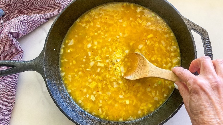 - Pour the broth into a separate pot and bring it to a boil. When the onion is done, add the rice to the pan and stir to fully coat in the butter mixture. Cook for about 1 minute, then add the hot broth, saffron liquid, and salt.
