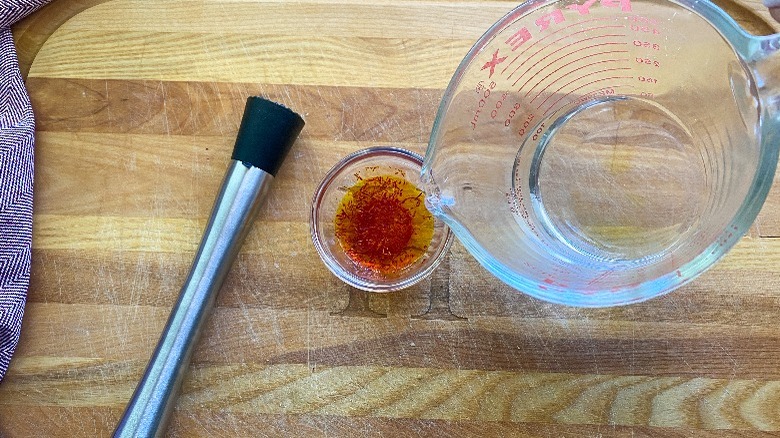 - Put the saffron threads in a small bowl and grind with a mortal and pestle. Add a few tablespoons of hot water and set aside.