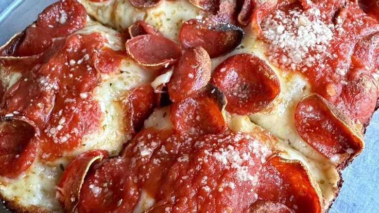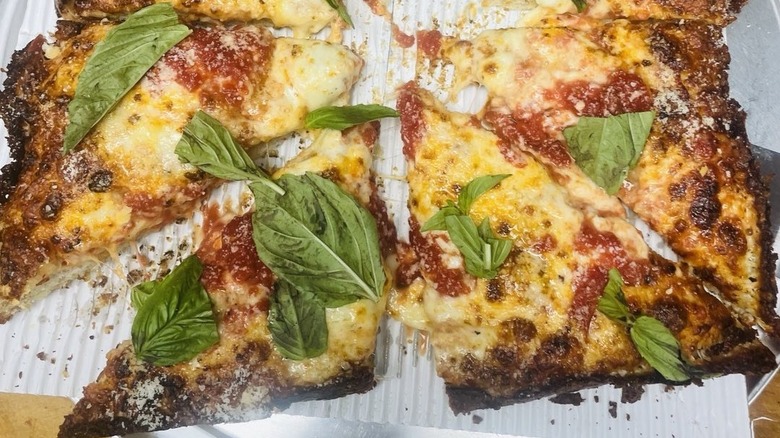 One thing we love about the pizzas at Grandma Bob's is that there's just a little dousing of extra cheese on top of it all. The pizzas are made in the classic Detroit style, with the cheese under the sauce, but there is just a little dusting of Parmesan over the top of it all. That subtle hint of salty cheese atop the sauce might not sound like much, but it is a wonderful accent in flavor. It's the proverbial cherry on top. And with some shredded basil on top, Grandma Bob's Pizza is some of the most photogenic Detroit-style pizza you're going to find.