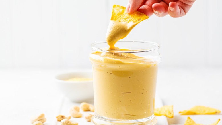 Start by soaking and blending raw cashews until creamy. Then add to a saucepan and heat over a low temperature, all the while keeping the cream moving. Add nutritional yeast, an acid of choice, a sweetener of choice, and salt. A dash of turmeric can help to make the cheese dip bright yellow, but if you prefer a whiter queso then don't include the colorful spice. Ingredients like diced tomato, diced chilies, hot sauce, onion powder, garlic powder, chili powder, smoked paprika, tomato paste, and lime juice can all be considered as additions to make it just how you like it.