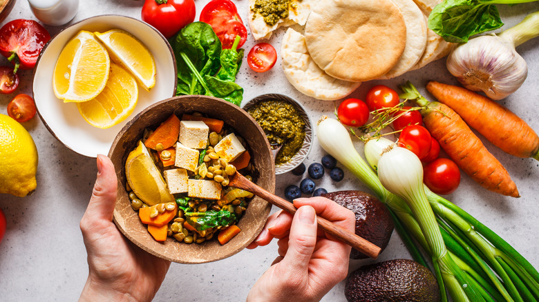 In addition, plants contain fiber while meats and dairy do not, and fiber-rich diets have dozens of health benefits. As explained by the Mayo Clinic, fiber helps to feed good gut bacteria, promoting a balanced gut microbiome. This does more than just aid digestion. It can help with heart health, mental health, can prevent certain cancers, and can even promote longevity. And there's good news for flexitarians, too: Even the reduction of meat and the introduction of more whole-plant foods is a step in the right direction when it comes to disease prevention. For those taking the first step, consider a Meatless Monday, or experiment with a few classic vegetarian favorites like pasta marinara, black bean tacos, and veggie fried rice.