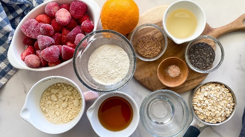 To make this recipe, you'll first need some flax seeds and chia seeds. "These are usually sold either with the grains and flours or in the supplement section of the store. Flax seeds are sold either whole or ground so you can either buy them already ground or buy them whole and grind them yourself in a small grinder," Hahn explains. Then, grab some rolled oats, almond flour, oat flour, salt, coconut oil, maple syrup, an orange, and frozen strawberries. You can easily make your own oat flour by just putting some rolled oats through the food processor, or you can use quinoa or brown rice flour if you have one of those on hand.