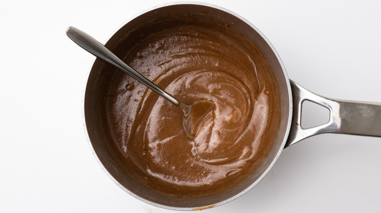 - Heat up the mixture over a low heat, mixing constantly, until the cookie crumbs have fully dissolved and the mixture becomes glossy. This should take about 5 minutes.