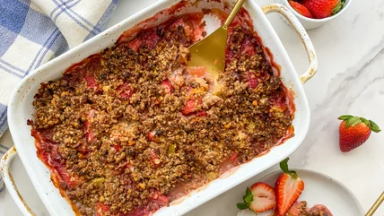 Wellness coach and recipe developer Miriam Hahn brings us her rendition of strawberry rhubarb crisp and says, "I love making desserts like this one because it's super easy to throw together and you can make it ahead of time and just warm it up when ready to serve. I don't cook with rhubarb very often but it's full of health benefits and this is a creative way to 'eat the rainbow' and get it in." There's nothing better than getting a healthy dose of fruit in a dessert, and this summery dessert recipe doubles-down on the fresh goodness.