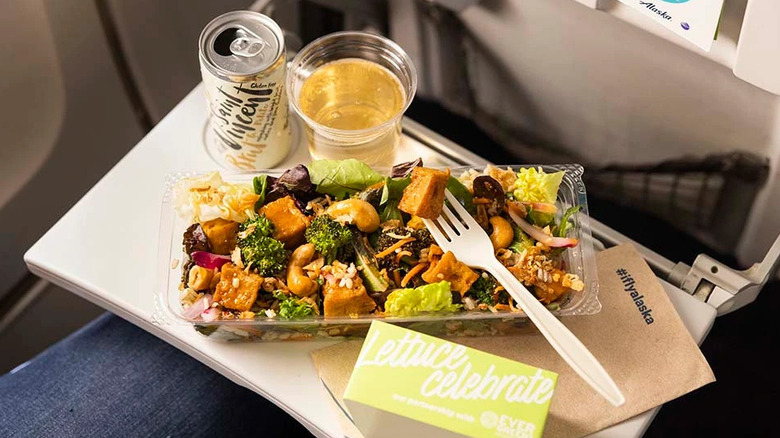 Alaska Airlines has developed many corporate partnerships to help make plant-based food more accessible for its passengers. One is Evergreens, a West-coast salad company that inspired the "Soy Meets World" salad with roasted broccoli, cucumber, carrots, fried tofu, lettuce, and brown rice served with a tamari chili-lime dressing. The airline also includes many local products, including ice cream from Portland's Salt & Straw and Ellenos Greek yogurt.