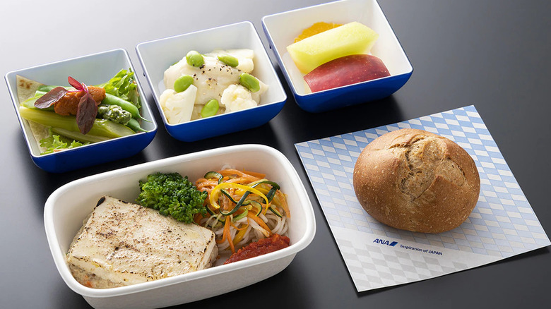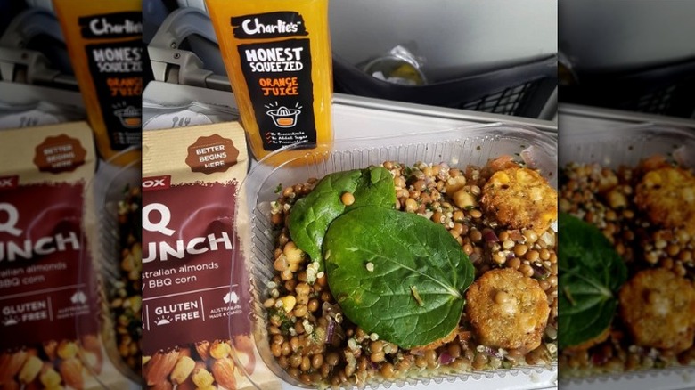 Indian food is one of the most notably vegan-friendly cuisines, so it isn't surprising that Air India would offer a lot of plant-based fare on its in-flight menu. As recently as April 2023, Air India announced it would start carrying more vegan-friendly options for its First and Business Class customers. Plant-based passengers flying in these classes can now order subz seekh kebabs, a plant-based starter on a stick made with vegetables and Indian spices. On your next Air India menu, you might also find warm Thai red curry with tofu or broccoli and millet steak, as well as Indian dishes like lemon sevaiyan upma (a dal curry made with vermicelli noodles), dal-based medu wada fritters, and masala uttapam — a South Indian breakfast crepe filled with spicy potatoes and vegetables.