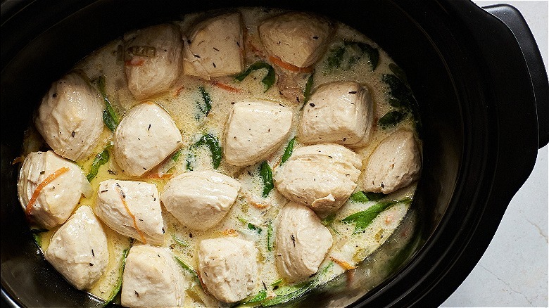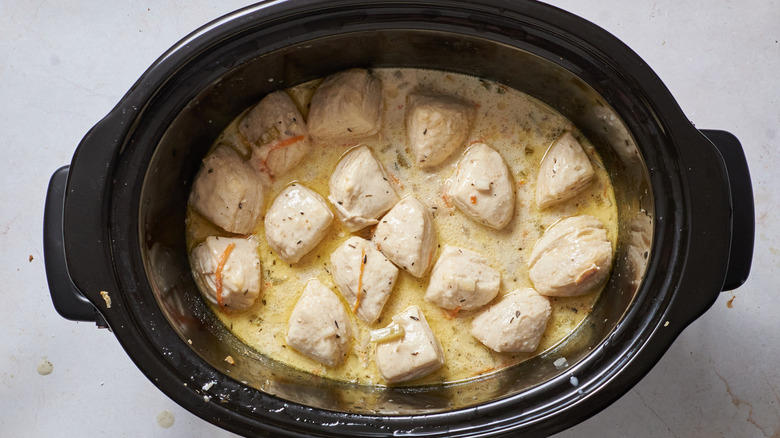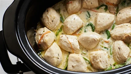 Everyone has a different idea of how a dumpling should look and taste. Many classic recipes call for thin, silky noodle-like dumplings that dissolve in your mouth. Commonly, the dumplings are made like biscuits and boiled until crispy, like a crust. We split the difference here and made a slightly crusty, silky dough ball, made possible by par-baking. Because the slow cooker never comes to a boil, if you drop in the biscuit dough without baking first, the dough will stay raw and dissolve into the broth (if you'd prefer that, go for it). To combat this, cut the biscuits into quarters, smash them down a little bit, then bake them until they rise but aren't crusty and golden yet. They'll be solid and baked through, but still squishy and pale.