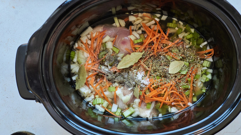 - Place the chicken, onion, celery, carrots, garlic, oregano, rosemary, bay leaves, and chicken stock in a slow cooker. Add a pinch of salt and pepper, then cover with lid and cook on high for 4 hours.