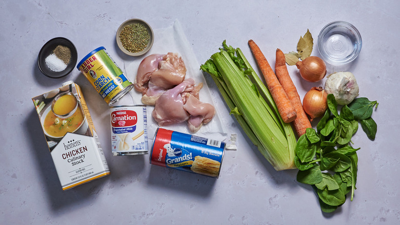 To make the shredded chicken base, you'll need boneless, skinless chicken thighs, onion, celery, carrots, garlic, oregano, rosemary, bay leaves, and chicken stock. You can swap the thighs for chicken breasts, but we prefer thighs here for how easily they shred apart. To make the soup creamy, you'll need a can of evaporated milk and some cornstarch dissolved in water. For the dumplings in this recipe, we're using canned biscuit dough, which you can find near the eggs in the refrigerated section of the grocery store (there will be cans of croissants, cinnamon rolls, and pizza dough nearby). Season it all with salt and pepper, then drop in spinach for some greens.