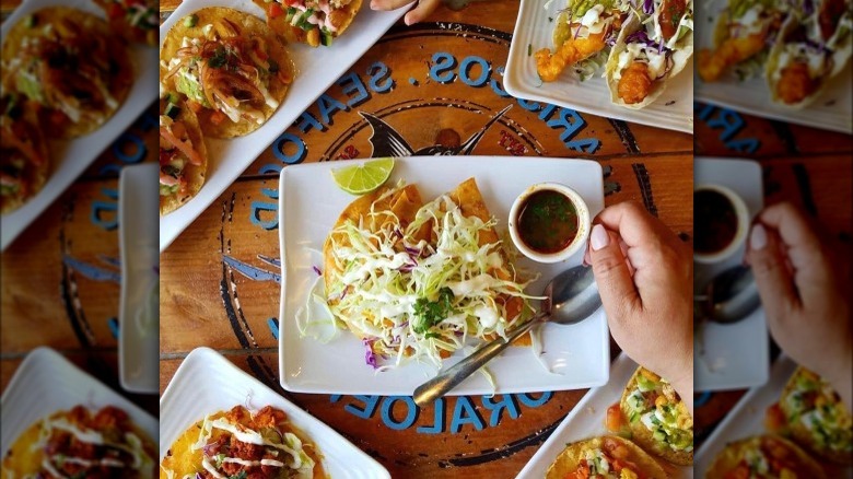 For folks indulging for the first time, its taco de camaron, also known as the crispy shrimp taco, is a customer favorite, and a must-order. The taco is bundled up, deep-fried, and topped with buttery avocado and bright salsa. Another go-to dish is the Poseidon, which is a crisp tostada loaded up with a tasty tower of shrimp ceviche, octopus, avocado, and spicy red aguachile.