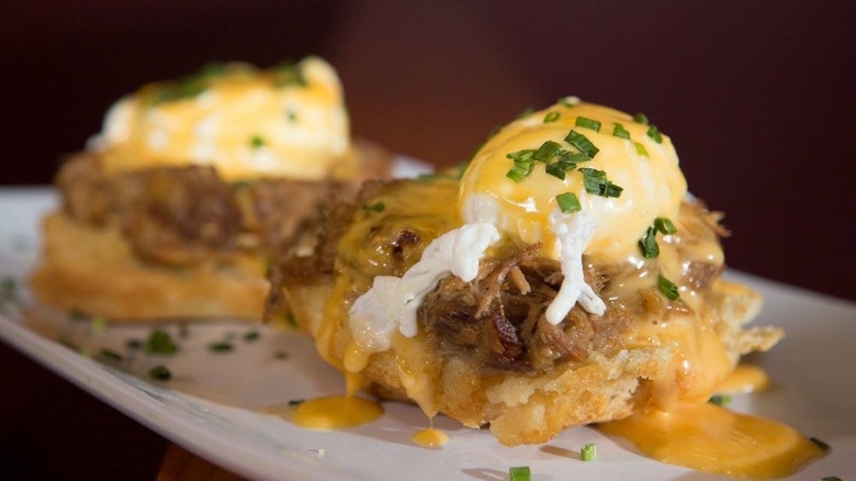 It's unclear where New Orleans' delicious response to eggs Benedict was invented, but eggs cochon has two ingredient swaps that set it apart from a regular Benedict. First, rather than using Canadian bacon, eggs cochon features pork debris, which is basically slow-cooked pulled pork — and rather than having a thin slice, eggs cochon gives you a stack of succulent pork, which not only offers more meat with each bite, but also offers a cushier surface area for the egg to rest on. One of the biggest annoyances with Eggs Benedict is having the egg slide off when you're cutting the dish into bites. With eggs cochon, you won't have to worry about that.
