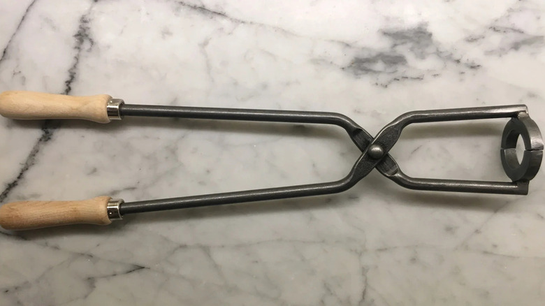 To remove the sediment, port tongs were invented. The tongs would be heated up in a fire until they were red hot, then they would be clamped around the neck of the bottle and used to cleanly sever the glass. The hot tongs would break the bottle, opening the bottle without worrying about an old cork breaking or crumbling into the wine if a corkscrew had been used. Finally, the port would then be poured out of the bottle, leaving the sediment behind.