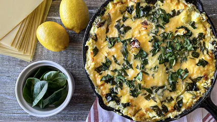 Judging by the recipe's name, you might be expecting something complicated, but it's actually simpler than you might think. All you need to make it is spinach (fresh, not frozen), olive oil, garlic, parmesan cheese, salt, ricotta cheese, lemons, lasagna noodles (Barrett opts for the no-boil kind), and gouda.