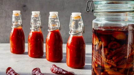 Making a fermented hot sauce is as easy as adding your favorite peppers, garlic, or onion for extra flavor and covering it all with a brine. Once you've combined all the ingredients in a jar with a loose-fitting lid, place a weight on top of the ingredients to make sure they stay beneath the brine while it ferments in a cool, dark location. It can take anywhere from five days to a few weeks to ferment, depending on your flavor preference. You'll know it's safe to consume when the brine has a cloudy appearance and there's a slight tart smell when you remove the jar's lid. These are both signals of a healthy fermentation process.