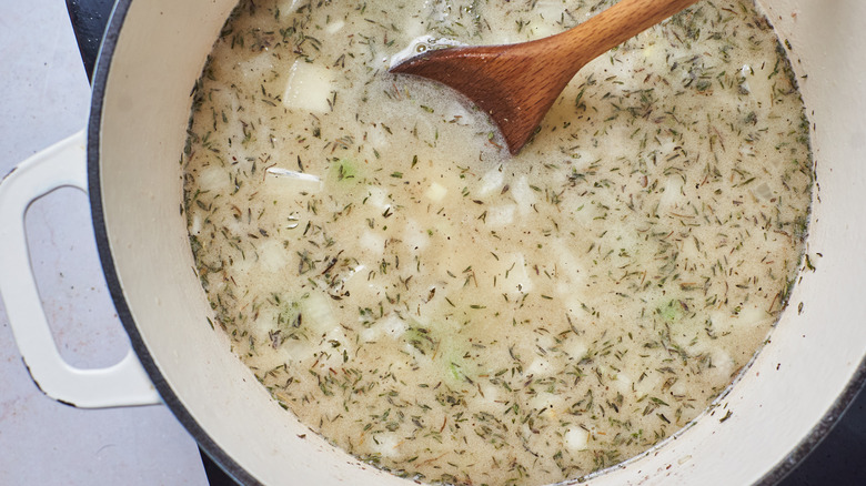 - Add the potatoes to the pot, and then pour in the vegetable stock or water. If needed, you can add more stock or water until the potatoes are completely submerged. Add the rosemary. Bring the pot to a boil, and cook the soup until the potatoes are fork-tender or about 15 to 20 minutes.