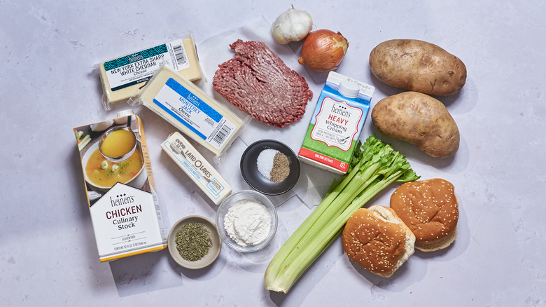 To make this loaded cheeseburger soup, you'll need 1 pound of lean ground beef, butter, chopped celery stalks, a yellow onion, and 4 minced garlic cloves. You'll also need ¼ cup all-purpose flour, 2 large russet potatoes, 4 cups of stock or water, and 1 tablespoon dried rosemary, salt and pepper, and heavy cream.
