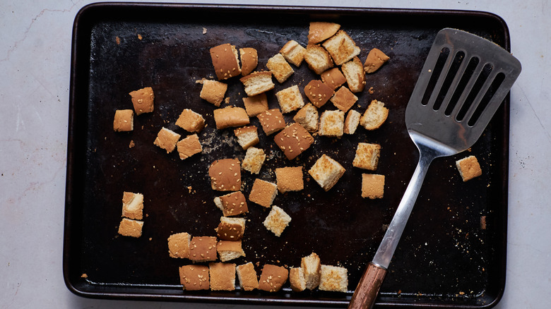 Although making your own croutons may feel like an extra, unnecessary step, McGlinn says that they are worth it. "The croutons are a must, in my opinion, and are very easy to make," she says. "Just pop them in the oven and toast until crispy, no oil needed. You can of course use any bread for this, but hamburger buns are cutest!"