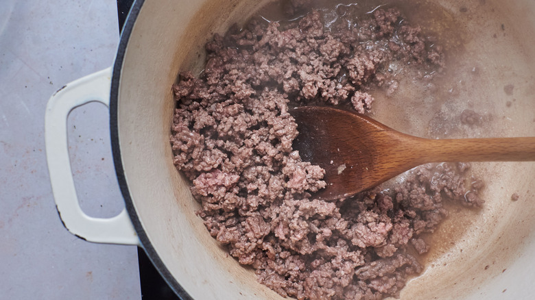 - Brown the beef in a large pot or Dutch oven. Crumble the beef into large chunks as it cooks -- small crumbles are also fine. Once the beef has browned, remove the beef from the pot and set it aside.