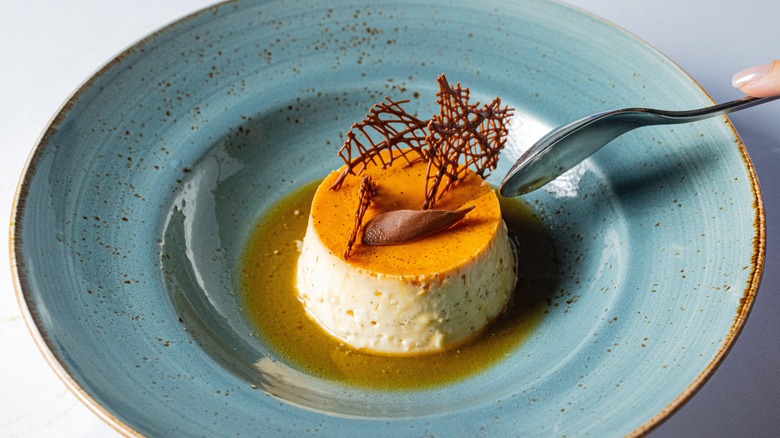 After crème caramel has finished cooking, the ramekin is inverted on a plate to serve. The top of the dessert is sticky and sweet, similar to crème brûlé — although the latter requires a blowtorch to produce a crunchy sweet topping.